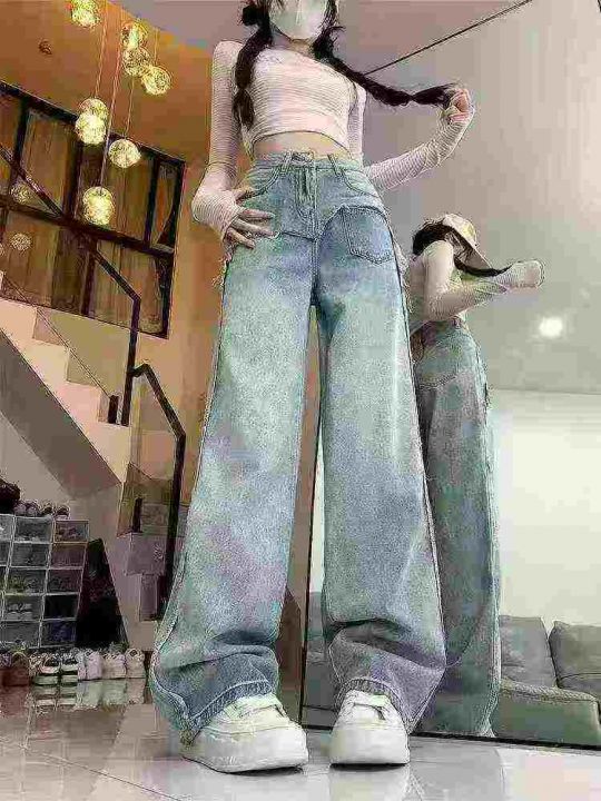 ☕️63033# 美式拼接毛边阔腿牛仔裤女秋季新款高腰宽松显瘦直筒长裤 350条...