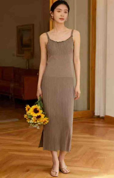 早秋新款奶乖甜极简复古港风开叉吊带针织连衣裙,独立包装,均码面料柔软舒...