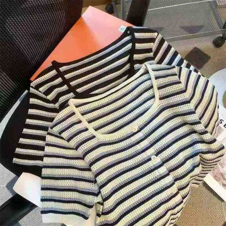 夏季新款撞色条纹小心机圆领宽松冰丝针织半袖,独立包装,均码面料柔软舒适...