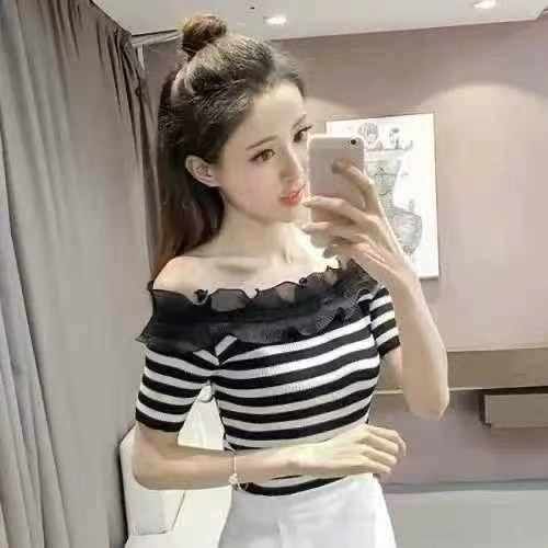 夏季新款时尚拼接小香风泡泡袖针织短袖,独立包装,均码面料柔软舒适,86件...