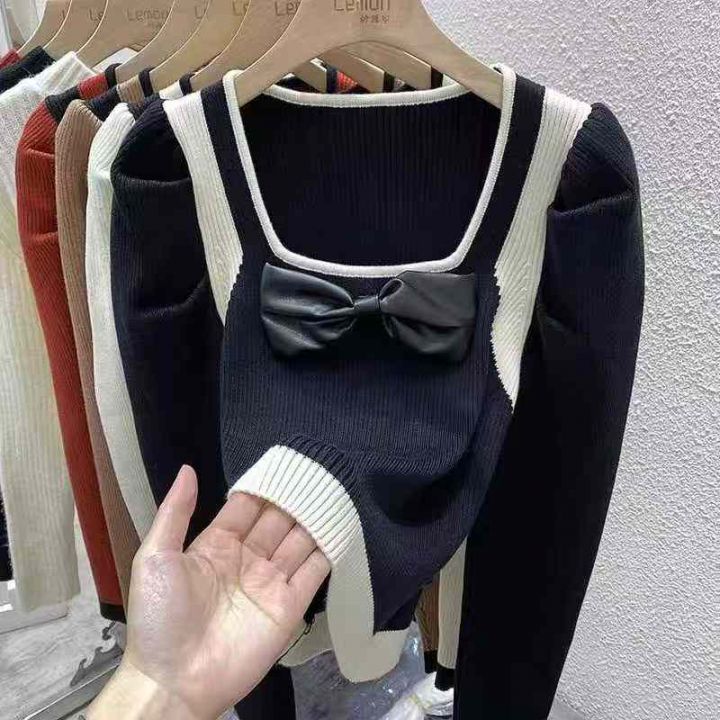 秋季新款小香风设计款泡泡袖法式方领蝴蝶结洋气长袖针织套头毛衣,独立包装...