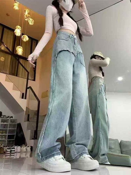 ☕️63033# 美式拼接毛边阔腿牛仔裤女秋季新款高腰宽松显瘦直筒长裤 600条...