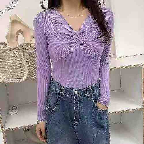 秋季新款弹力修身显瘦交叉扭结v领纯色针织套头毛衣,独立包装,均码面料柔...