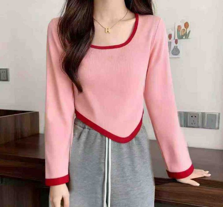 秋冬新款撞色高腰设计不规则纯欲风短款针织套头毛衣,独立包装,均码面料柔...