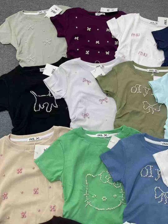 ☕️纯棉重工辣妹短袖T恤立体钉珠弧形下摆精致泡珠工艺修身显瘦气质辣妹T恤...