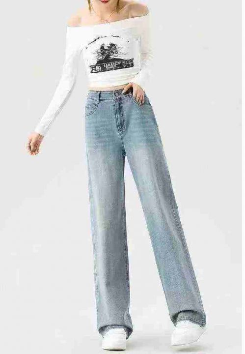 欧美风ins条纹牛仔裤女高腰显瘦阔腿设计感宽松直筒拖地裤,独立包装,S -x...