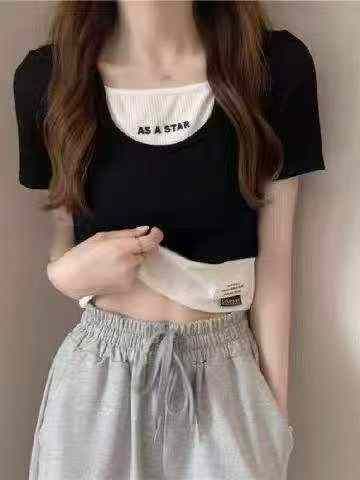 285件短款木耳边网纱打底衫女短袖内搭纱衣圆领新款亮丝半截蕾丝上衣,双层...