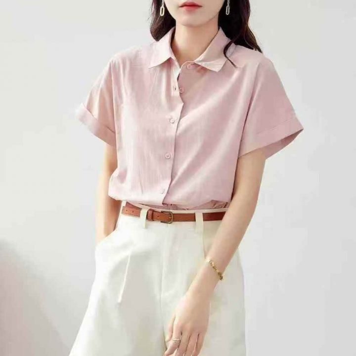 ☕️全棉粉色短袖衬衫女新款夏季白衬衣职业通勤女装穿搭宽松上衣200件全清8...