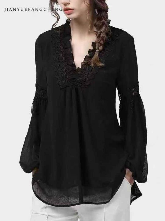 ☕️欧货黑色五分袖洋气雪纺衫宽松v领镂空上衣蕾丝衫女秋夏衬衫小衫300件全...