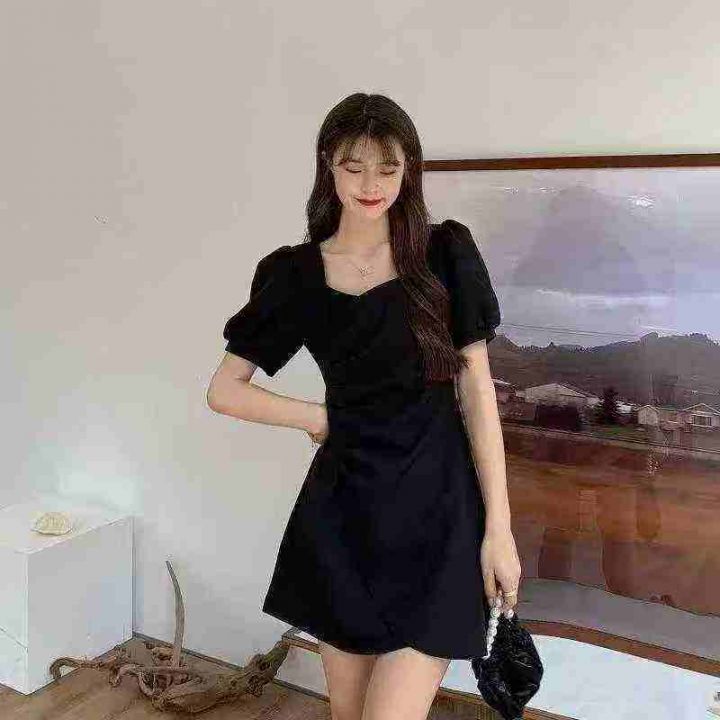 夏季新款不规则法式方领褶皱连衣裙清纯女装甜美气质中长款连衣裙 独立包装 ...