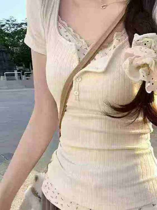 全清5.9甜辣妹假两件温柔碎花短袖T恤女春夏内搭打底衫 ,独立包装,数量171...