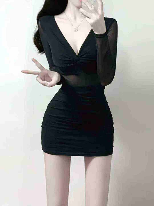 纯欲风性感V领连衣裙女秋冬季甜辣妹设计感内搭网纱修身包臀短裙,单款单色...