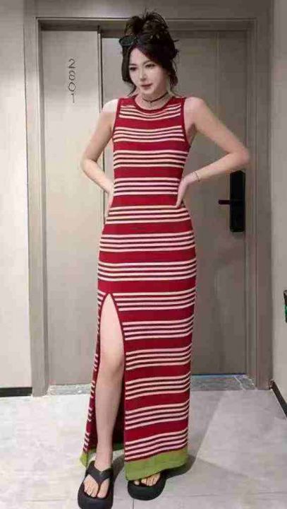 夏季新款撞色条纹韩系冰丝开叉大长款针织背心连衣裙,独立包装,均码面料软...