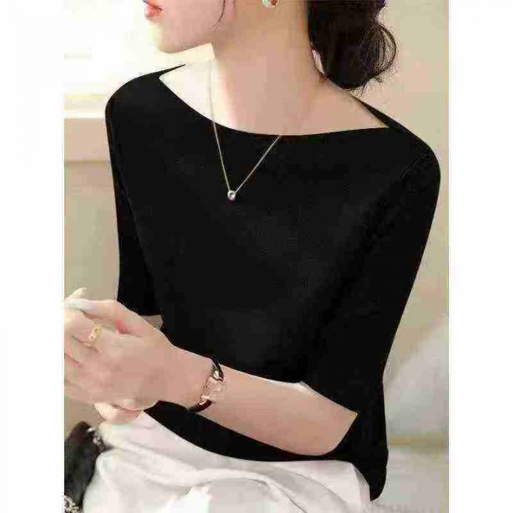 中袖洋气螺纹一字领上衣内搭纯欲风T恤显瘦打底衫,单款三色,独立包装,尺...