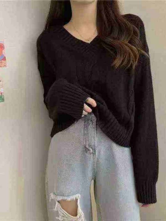 秋冬新款韩系短款宽松麻花设计款V领套头毛衣,独立包装,均码面料软糯厚实...