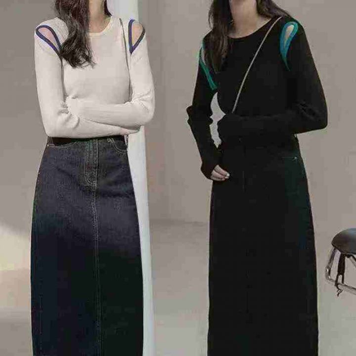 针织撞色镂空修身上衣女秋冬百搭显瘦可外穿内搭毛衣,整款2色,S-5XL码,弹...
