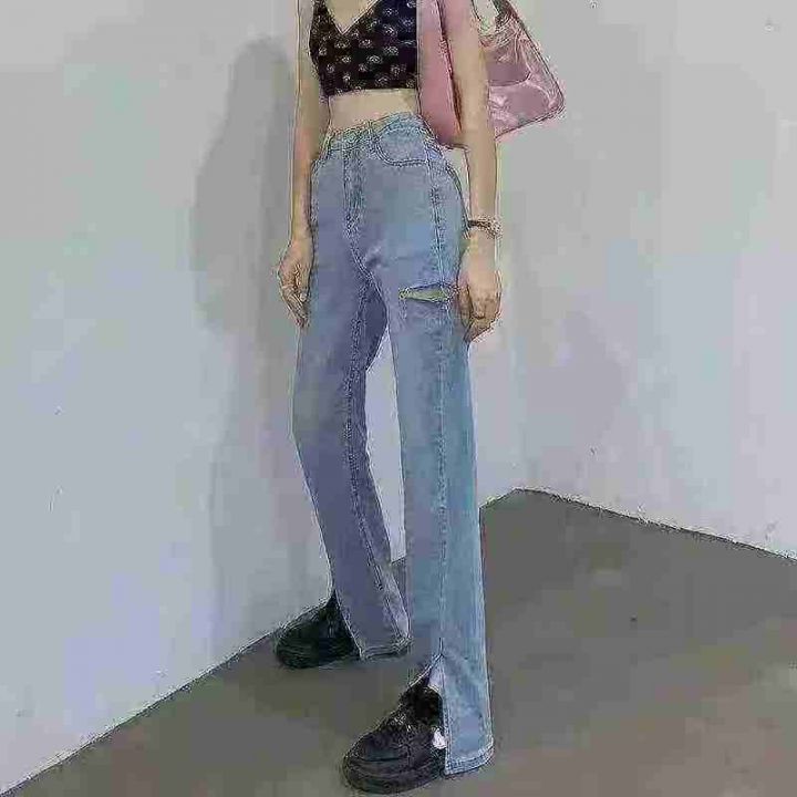 全清9.8垂坠感女装mm宽松显瘦高腰破洞开叉牛仔裤,网络图仅供参考,码数:XS-X...