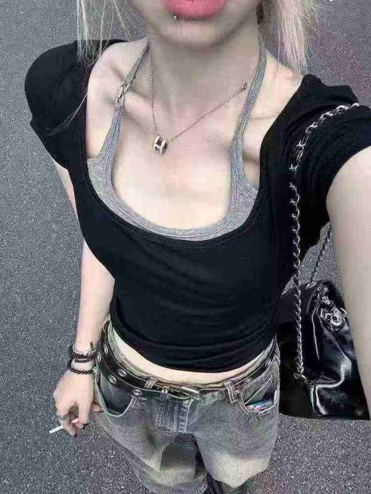 ☕️美式甜辣妹黑色挂脖短袖t恤300件全清8.8元,单款黑色,S到XL码数,独立...