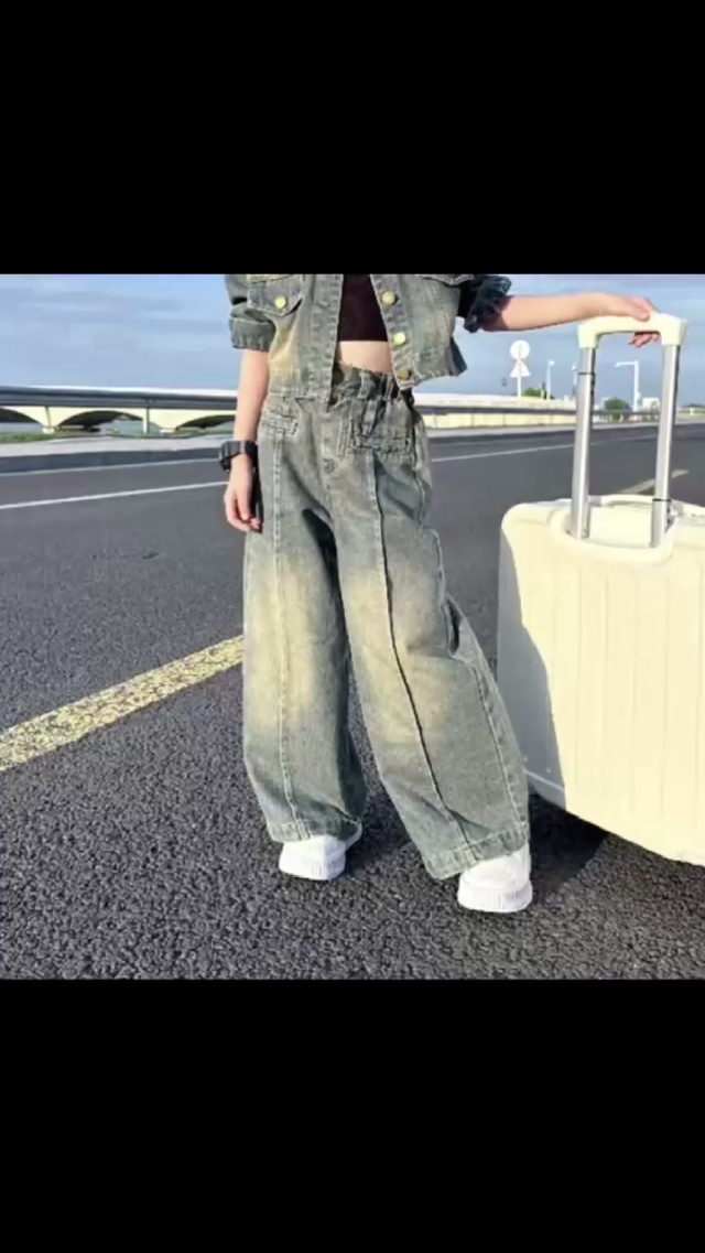 美式复古水泥灰直筒牛仔裤女高腰宽松垂感阔腿裤子,单款单色,独立包装带腰...