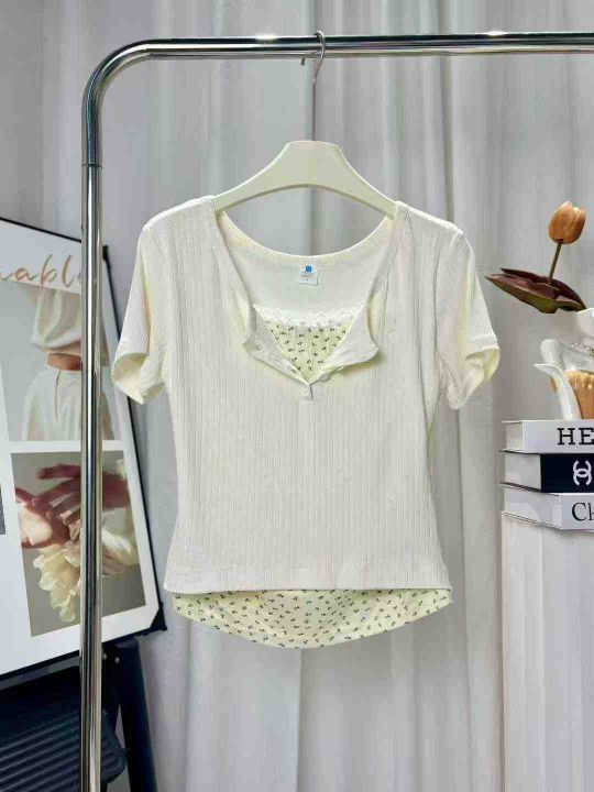 夏季新款蕾丝花边拼接假两件修身显瘦纯欲穿搭短款T恤上衣, 面料亲肤舒适高...