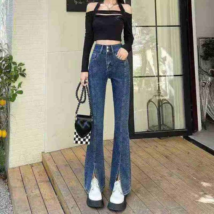 高弹力网红高腰喇叭开叉牛仔裤女,单款四色,独立包装带吊牌,码数25-32,...
