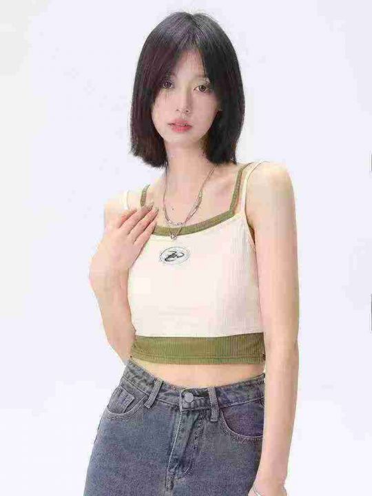 [月亮]:3.9清257件[月亮]:日系复古撞色假两件辣妹吊带上衣[月亮]:SMLXL...