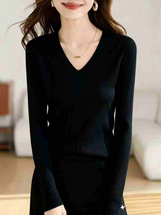 秋冬新款法式V领弹力修身高级显瘦气质打底通勤包芯纱长袖毛衣,独立包装,...