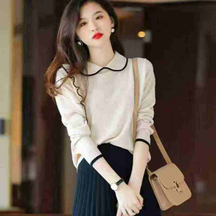 秋冬新款韩系温柔风撞色翻领长袖包芯纱套头毛衣,面料软糯舒适弹力大,宽松...