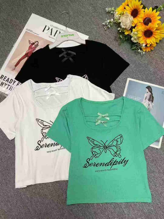 夏季新款甜辣妹绝美设计感小众蝴蝶印花u领弹力修身显瘦棉T桖,独立包装,均...