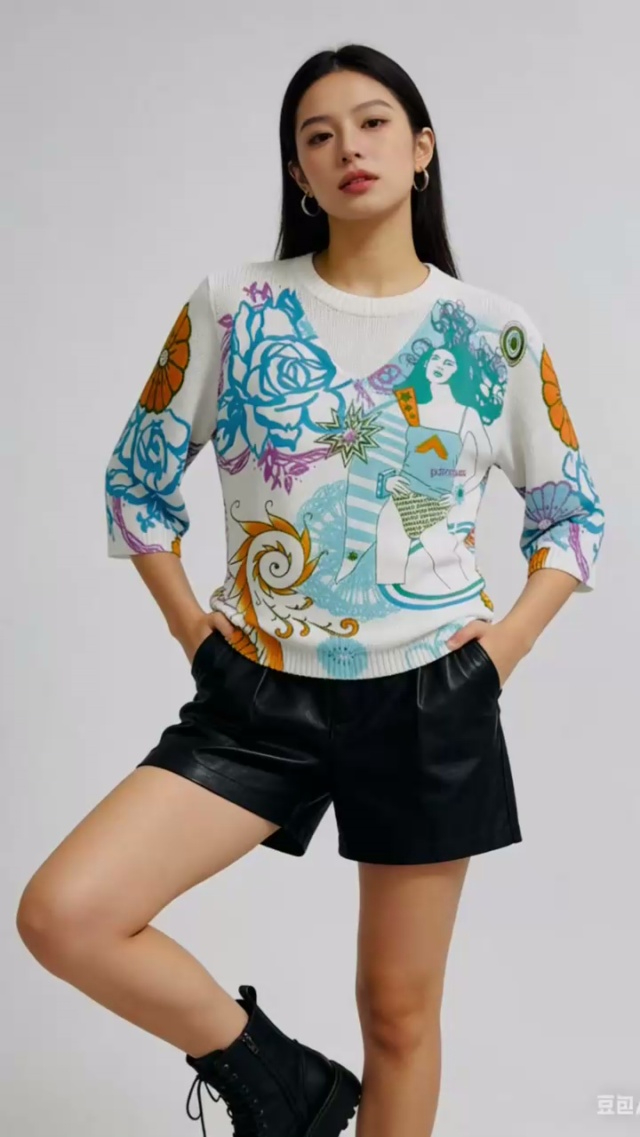 全清:6.8时尚洋气V领印花针织中袖上衣,小整花型图案多,品质好,数量:10...