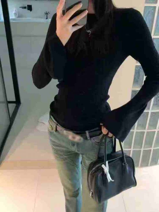 73件韩系靓妹款黑色圆领喇叭袖包芯纱针织衫女早秋小个子修身显瘦内搭气质打...