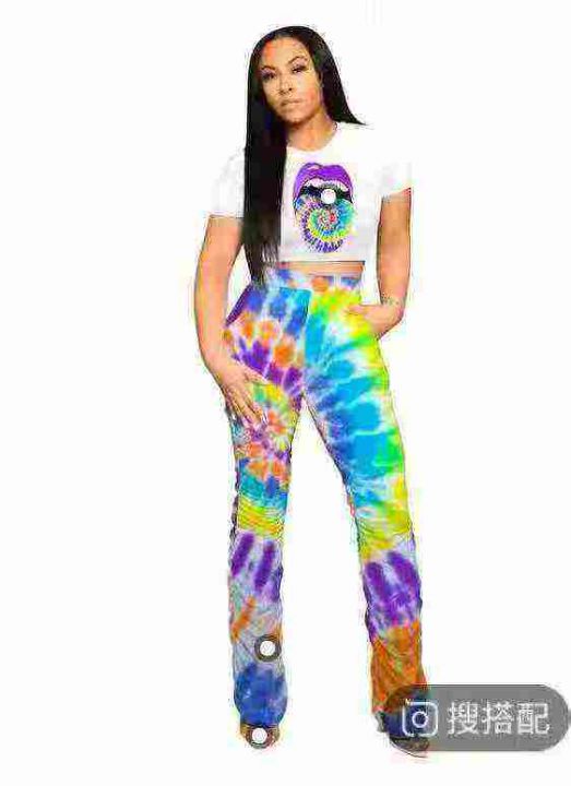 2.8清款号:DN8359欧美时尚外穿薄款松紧腰紧身彩色印花褶皱裤,裤脚开衩设...