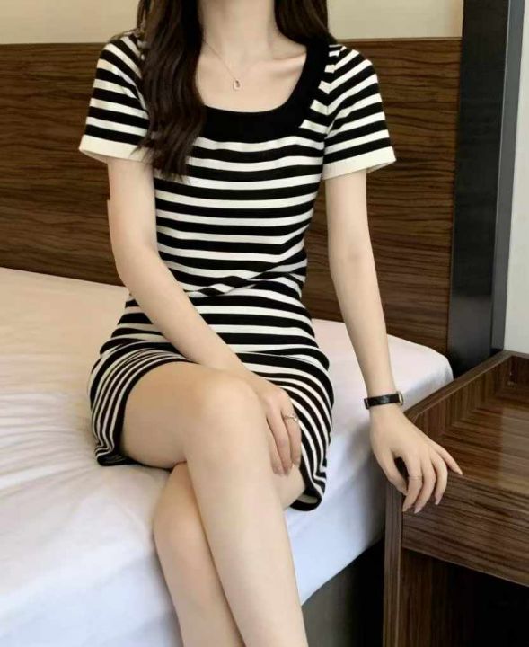 夏季新款撞色法式复古条纹方领短袖t恤针织连衣裙,独立包装,均码面料柔软...