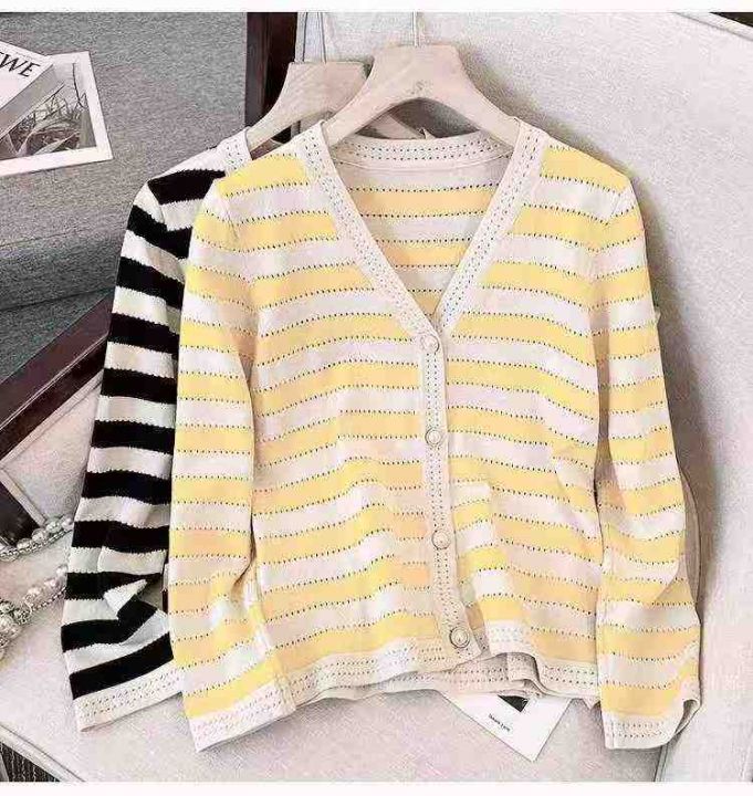 秋季条纹v领宽松小香风设计感遮肚显瘦长袖针织开衫,独立包装,均码面料柔...