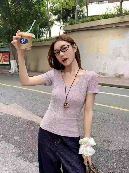 [月亮]:6.5清1240件[月亮]:韩系褶皱肌理感V领正肩T恤[月亮]:135码 独立...