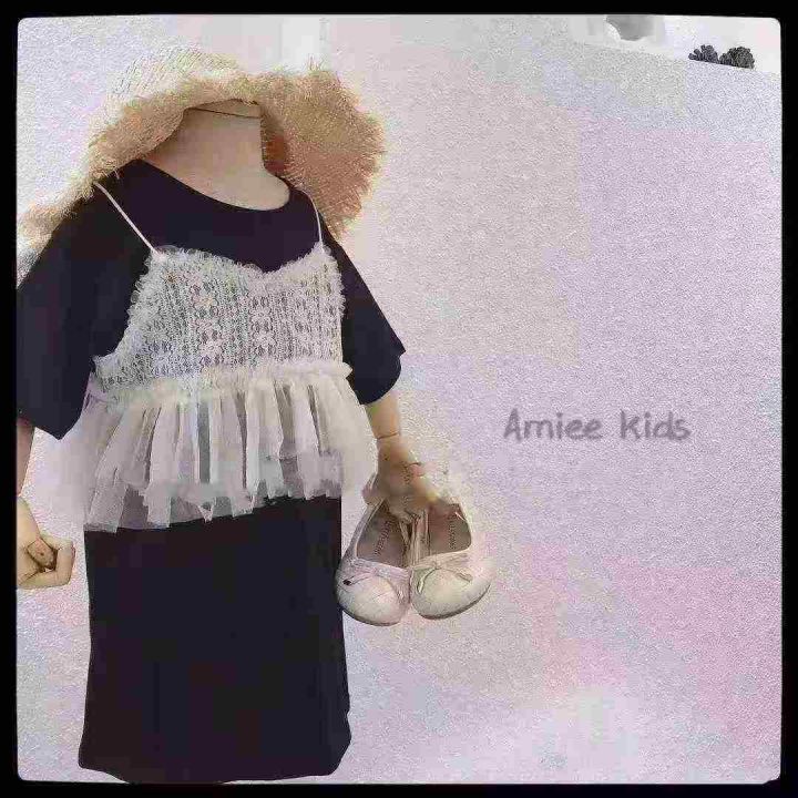 全清6.8237件女中大童中长款连衣裙夏装洋气女孩韩版短袖蕾丝假两件吊带T恤...