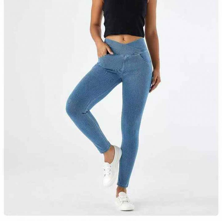秋冬新款高腰交叉高弹力修身显瘦提臀双口袋健身瑜伽牛仔裤,独立包装,码数...