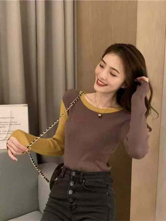 秋冬新款高弹力修身显瘦撞色设计感包芯纱打底长袖针织衫,独立包装,均码面...