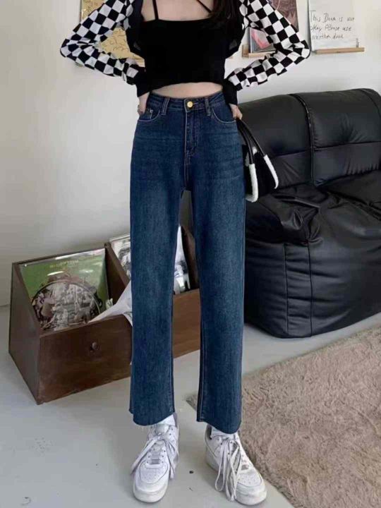 冬季新款加绒牛仔裤女宽松大码高腰直筒外穿阔腿老爹长裤子980件,独立包装...