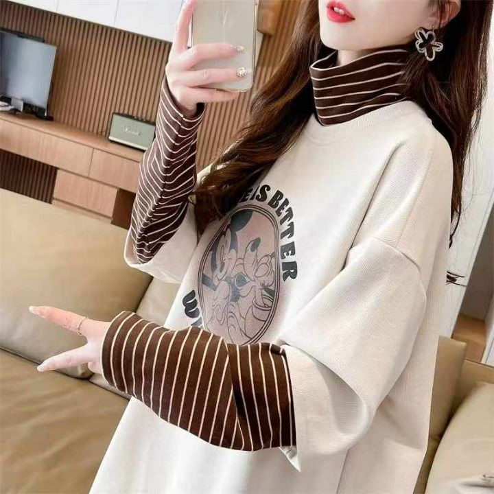冬季新款加绒大码假两件长袖拼接慵懒风韩版宽松百搭加绒印花打底上衣,独立...