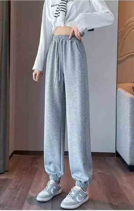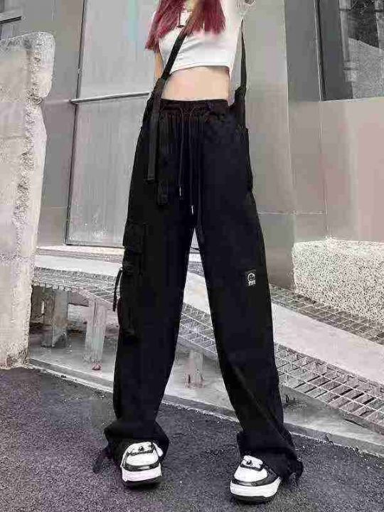 523条,港风休闲裤女2025夏季新款宽松阔腿裤薄款抽绳束脚拼接学生运动裤,...