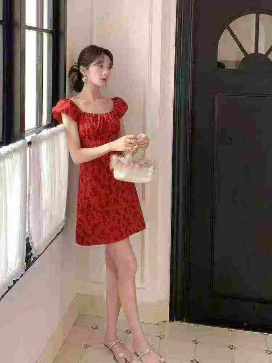 法式方领复古红色提花连衣裙女夏季新款收腰显瘦泡泡袖短款茶歇裙,数量61件...