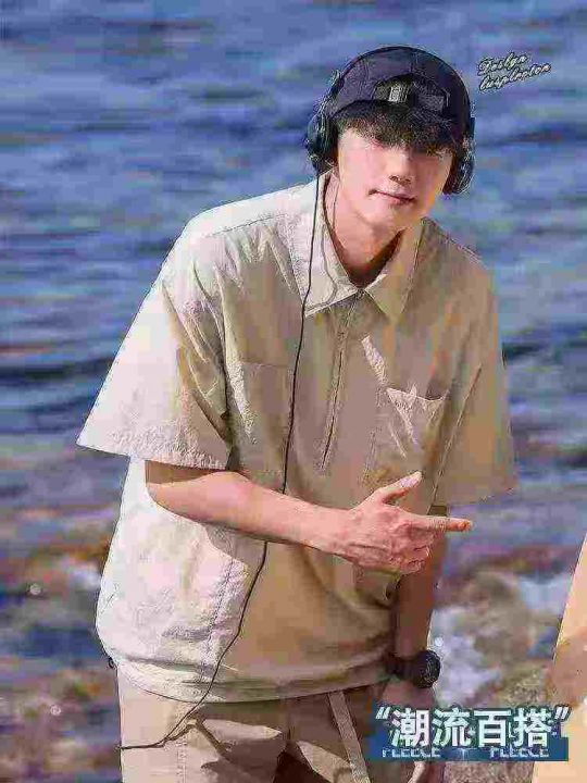 全清价6.8元捡漏100件日系复古拉链潮牌翻领短袖t恤潮流宽松百搭工装衬衣,...