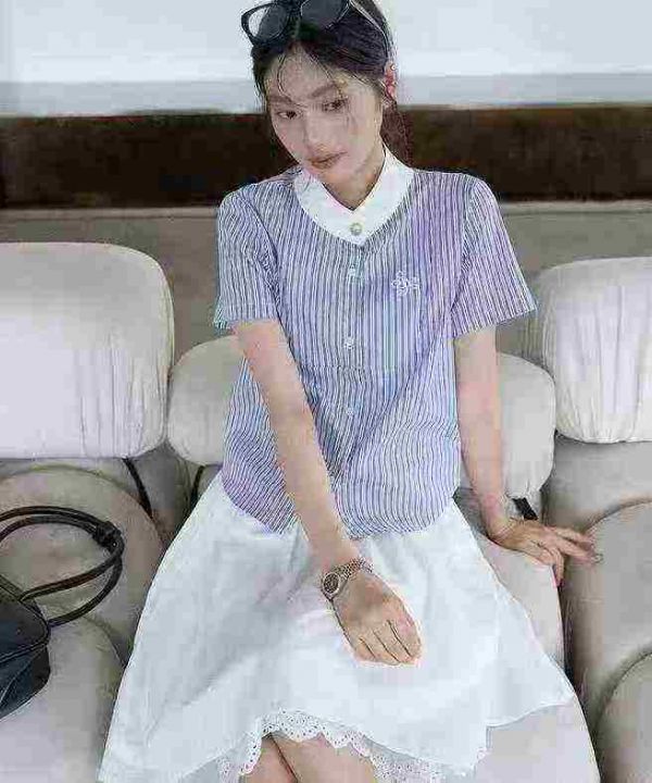 蓝色条纹短袖衬衫164件7.9,撞色拼接,后领包边,图案刺绣,弧形下摆,码数...