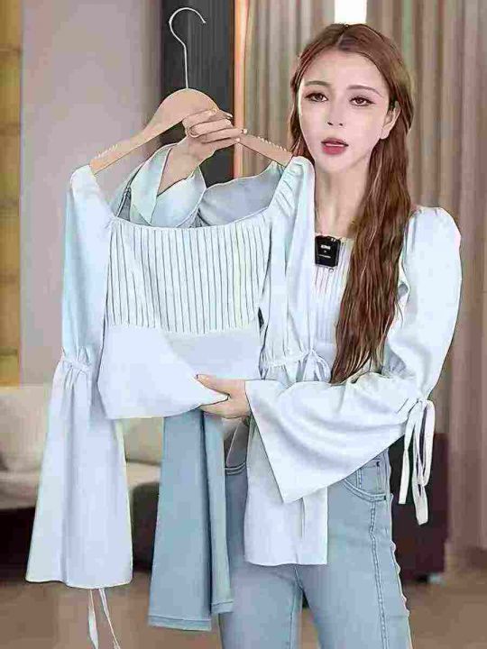 ☕️夏季蓝色衬衫长袖方领法式气质雪纺小衫宽松短款洋气独特别致上衣122件...