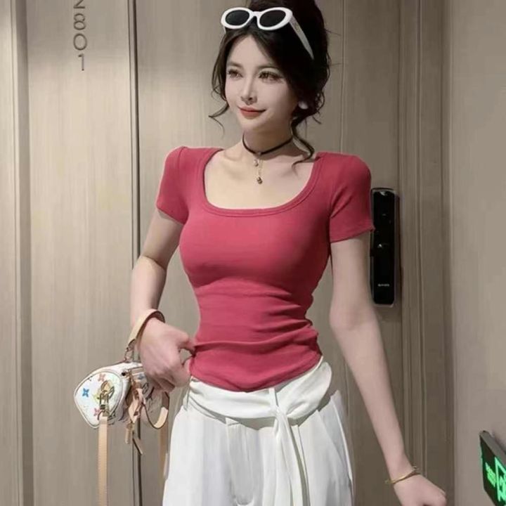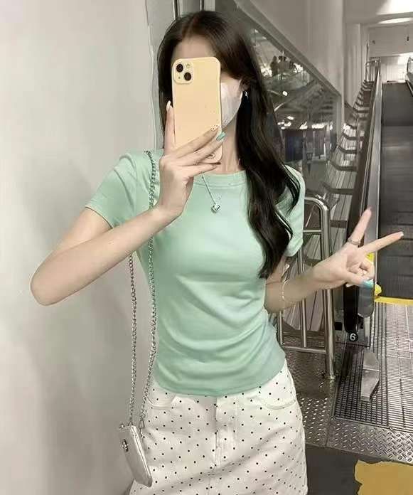 [月亮]:5.9清970件(款号8805)[月亮]:纯欲方领露锁骨正肩短袖T恤[月亮]...