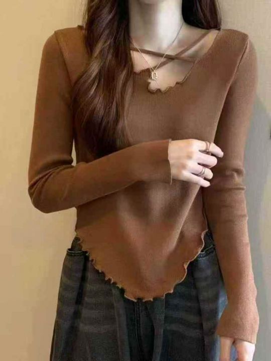 秋冬新款不规则辣妹纯欲风美拉德色系木耳斜边独特设计长袖针织衫,独立包装...