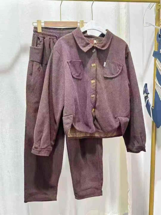 翻领灯芯绒保暖套装女2025冬季加绒加厚宽松显瘦卫衣直筒裤两件套,数量230...