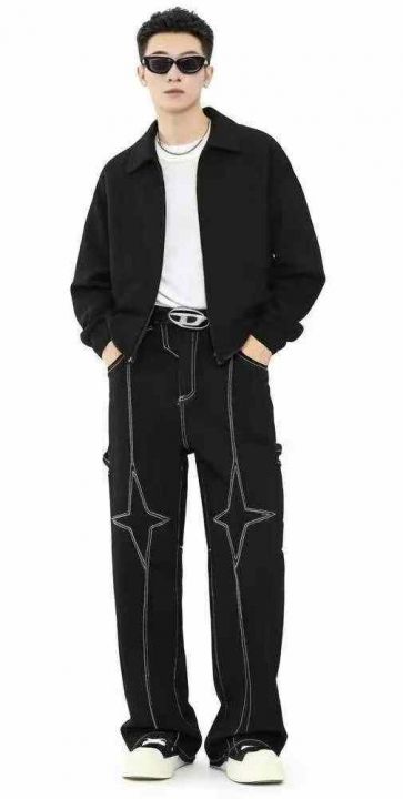 春季新款男士宽松潮牌拼接描边线条感哥特风直筒阔腿美式工装牛仔阔腿裤,独...