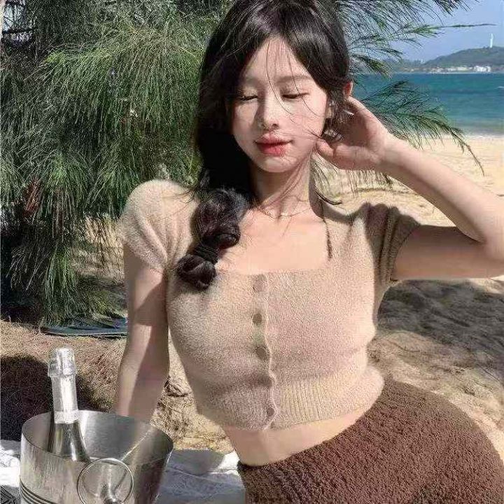 春夏季新款净版简约防水貂辣妹性感短款针织短袖开衫,独立包装,均码面料软...